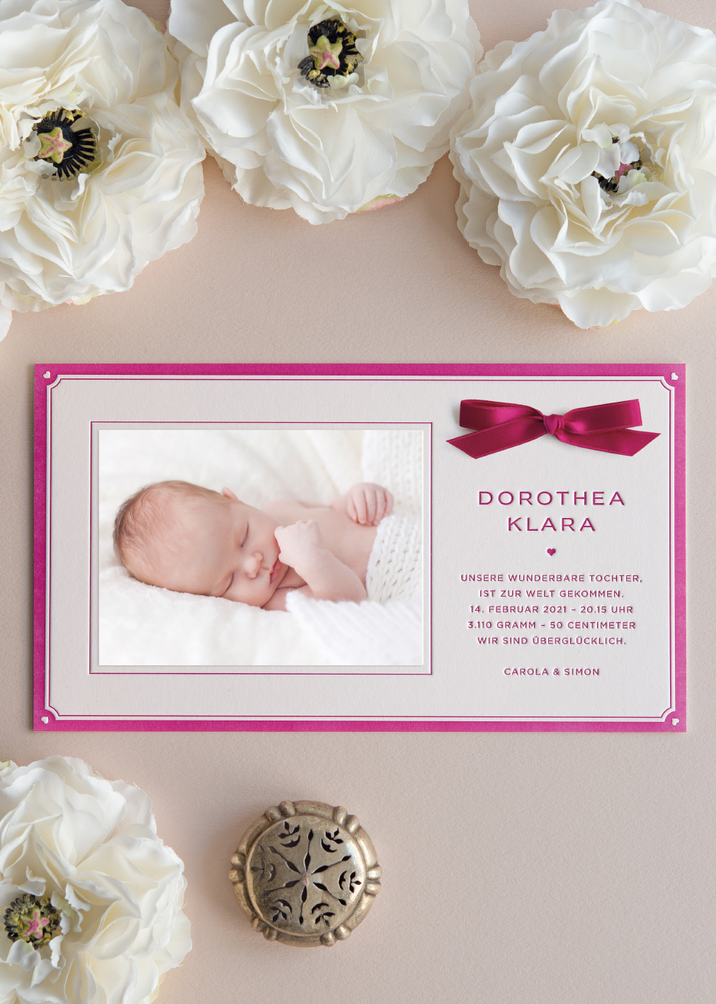 Je ausgefallener die Druckfarbe, desto effektvoller die Wirkung dieser Letterpress-Geburtsanzeige. Die aussagekräftige Umrandung wertet das moderne und zurückhaltende Design zu einem Schmuckstück auf. Besonders süß: die dezenten kleinen Herzchen in der Bordüre sowie das handgebundene Satinbändchen, das farblich perfekt in das charmante Gesamtbild passt.