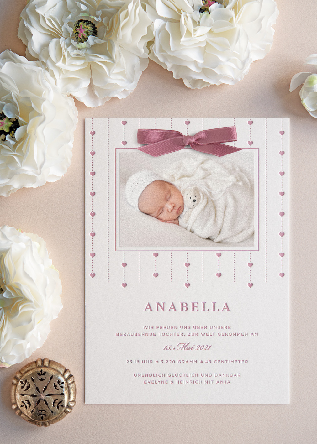 Das Design dieser bezaubernden Geburtskarte ist in jeder Hinsicht von Herzlichkeit geprägt. Das harmonisch wiederholende Muster mit dem Symbol der Liebe steht aber nicht nur der süßen Geburtsanzeige ausgezeichnet. Es verleiht auch den Taufeinladungen und den Kirchenheften, bzw. der gesamten Dekoration bei den Feierlichkeiten Gefühlswärme und Stil. Frische Druckfarben, Ihre schönsten Fotos und schicke, handgefertigte Satin-Schleifen vollenden das süße Design.