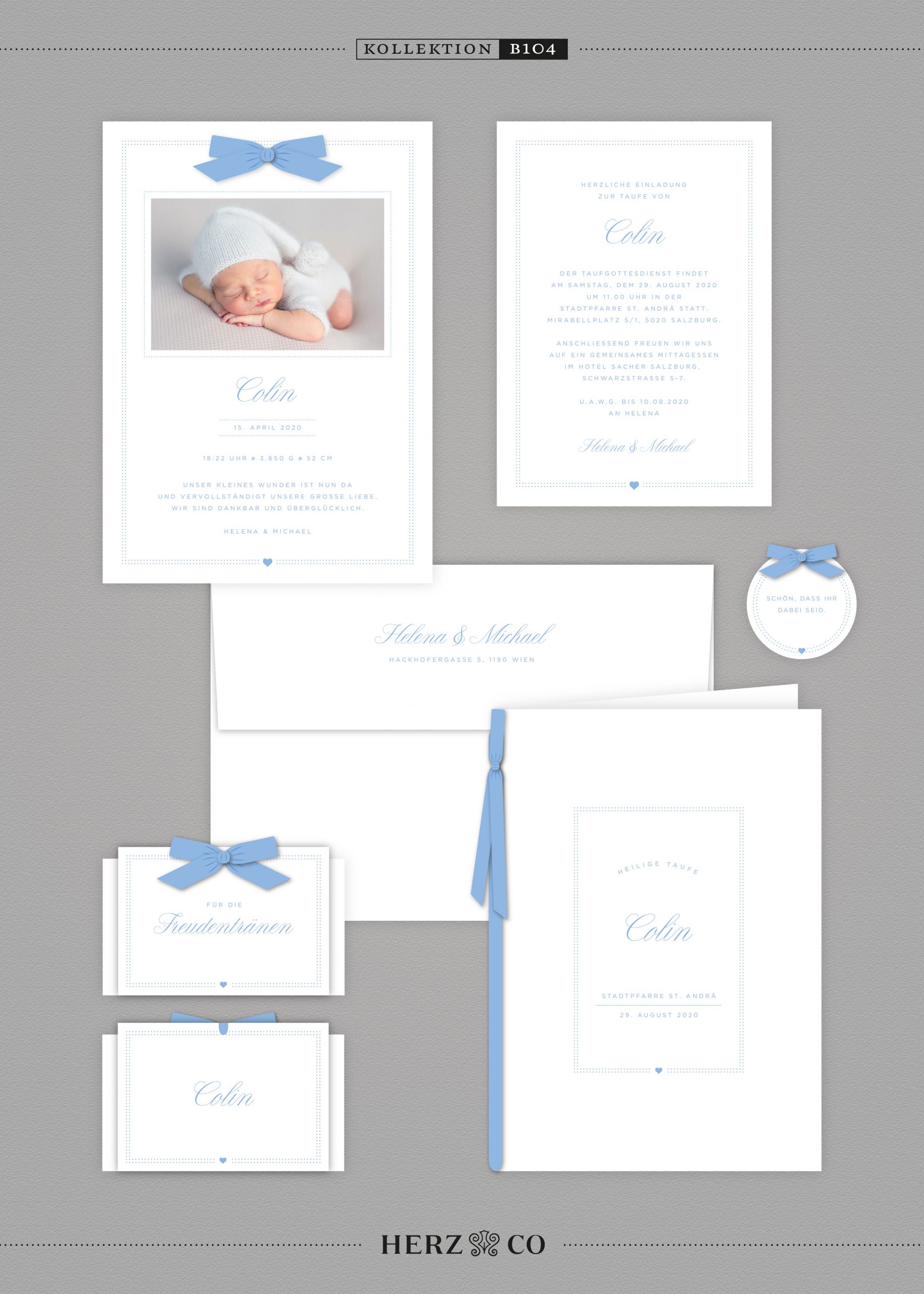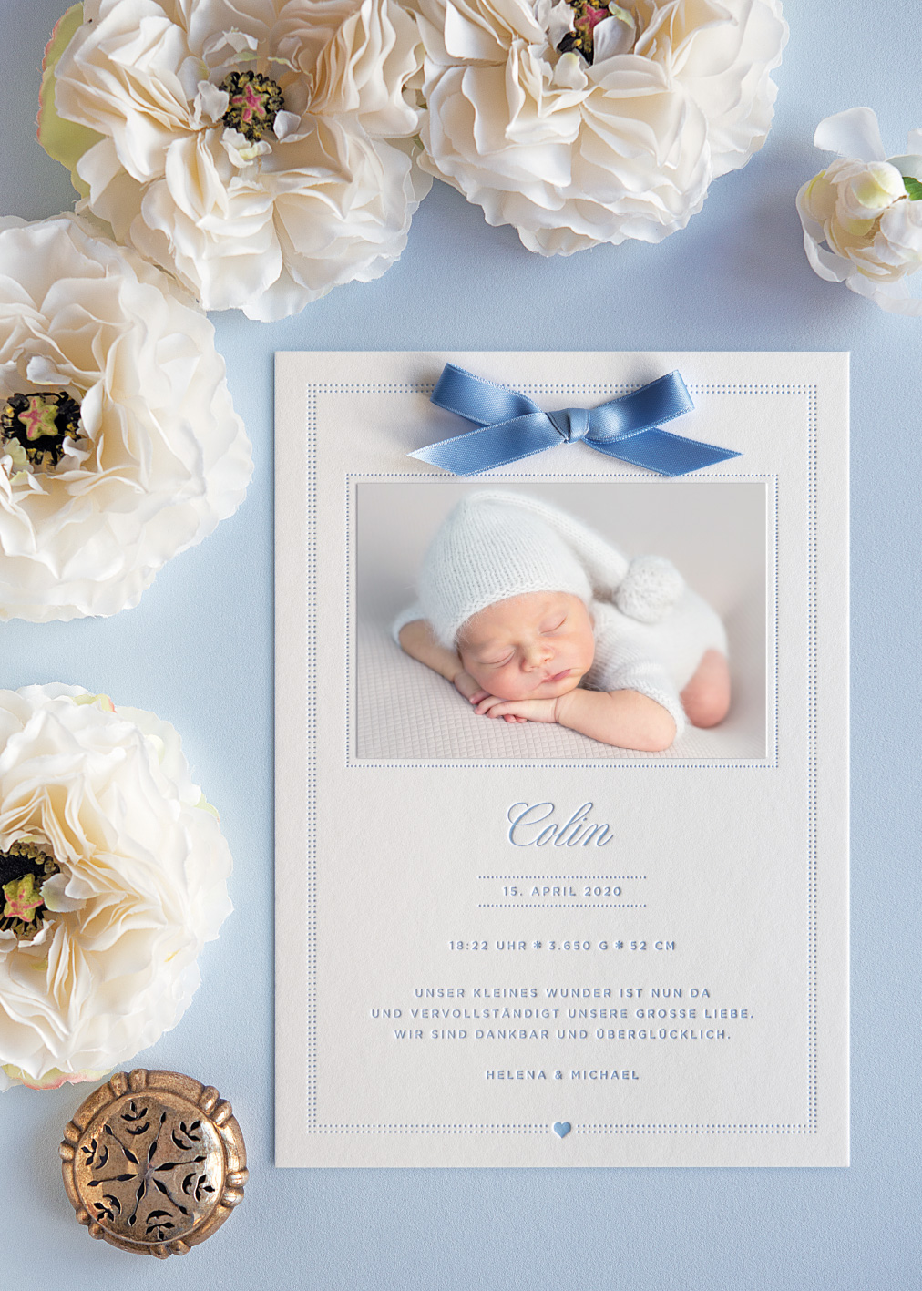 Oft erwünscht sind bei Letterpress-Geburtsanzeigen zarte Pünktchen-Dekore, die auf den weichen und exklusiven Büttenpapieren gleichzeitig schlicht und elegant ausmachen. Und genau die ausgesprochen feine Details sorgen hier für akzentuierte, spürbare Silhouetten, für das gewisse Etwas. Diese Babykarte wurde in hellen Tönen entworfen und erhielt als zusätzlichen Blickfang eine farblich angepasste handgebundene Schleife im Zentrum.