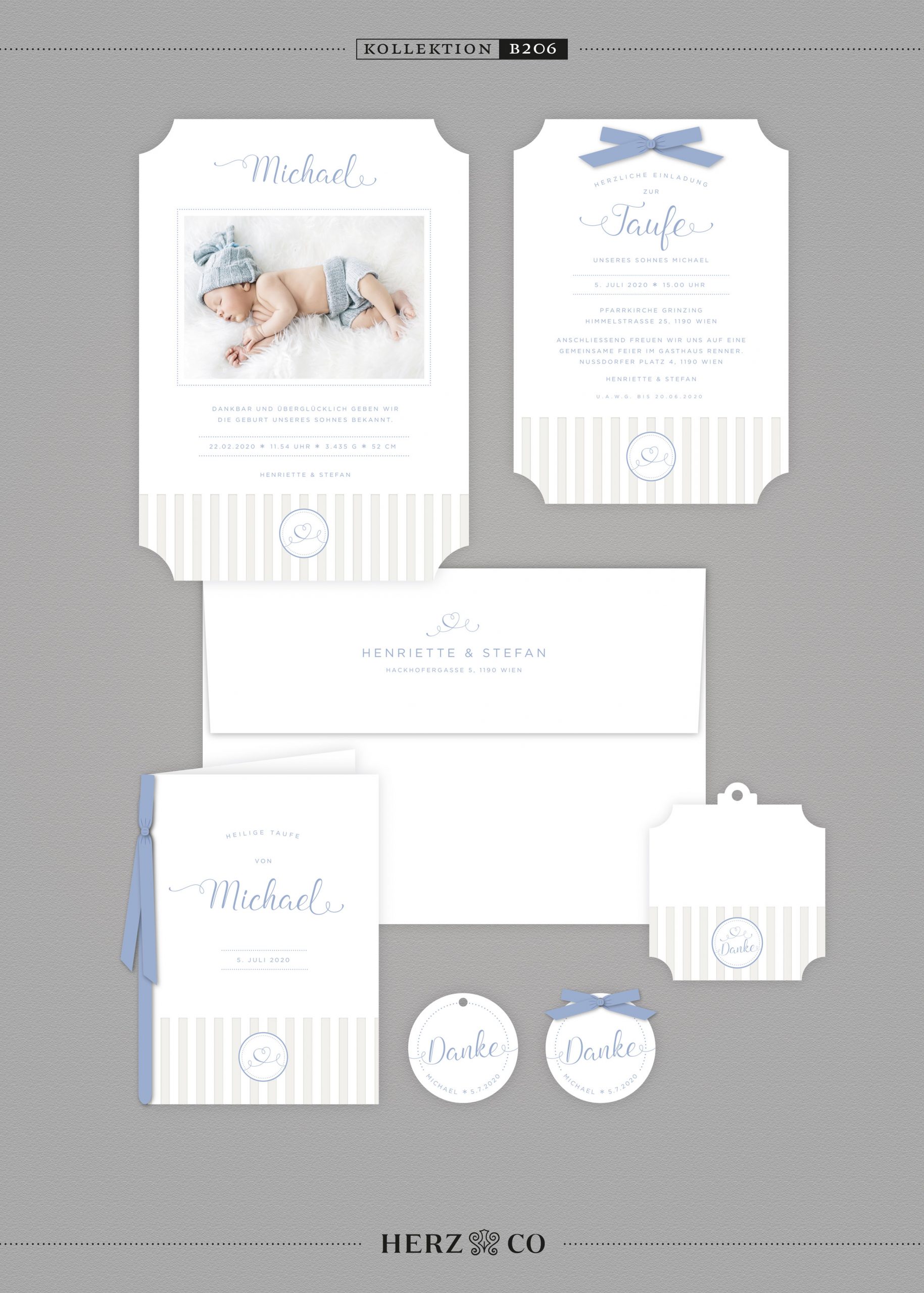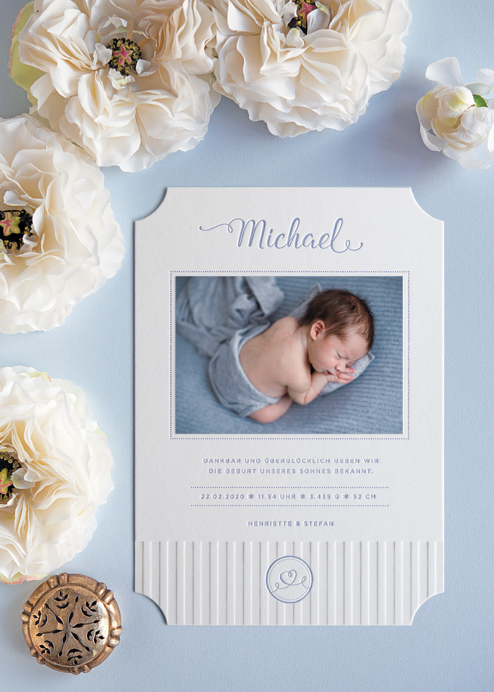»Elegant und modern« – so beschreiben wir diese schöne und liebevoll gestaltete Letterpress–Geburtsanzeige. Ein Widerspruch? Im Gegenteil: die Kombination aus farblos geprägten Streifen-Elementen, leicht geschwungenen, edlen Schriftarten und der originellen Kartenform als modernes Detail, passen wunderbar zusammen. Und das nicht nur auf der Geburtskarte. Jeder einzelne taktile Streifen auf der Taufeinladung, dem Kirchenheft oder dem Fotoalbum im Set ist absolut perfekt.