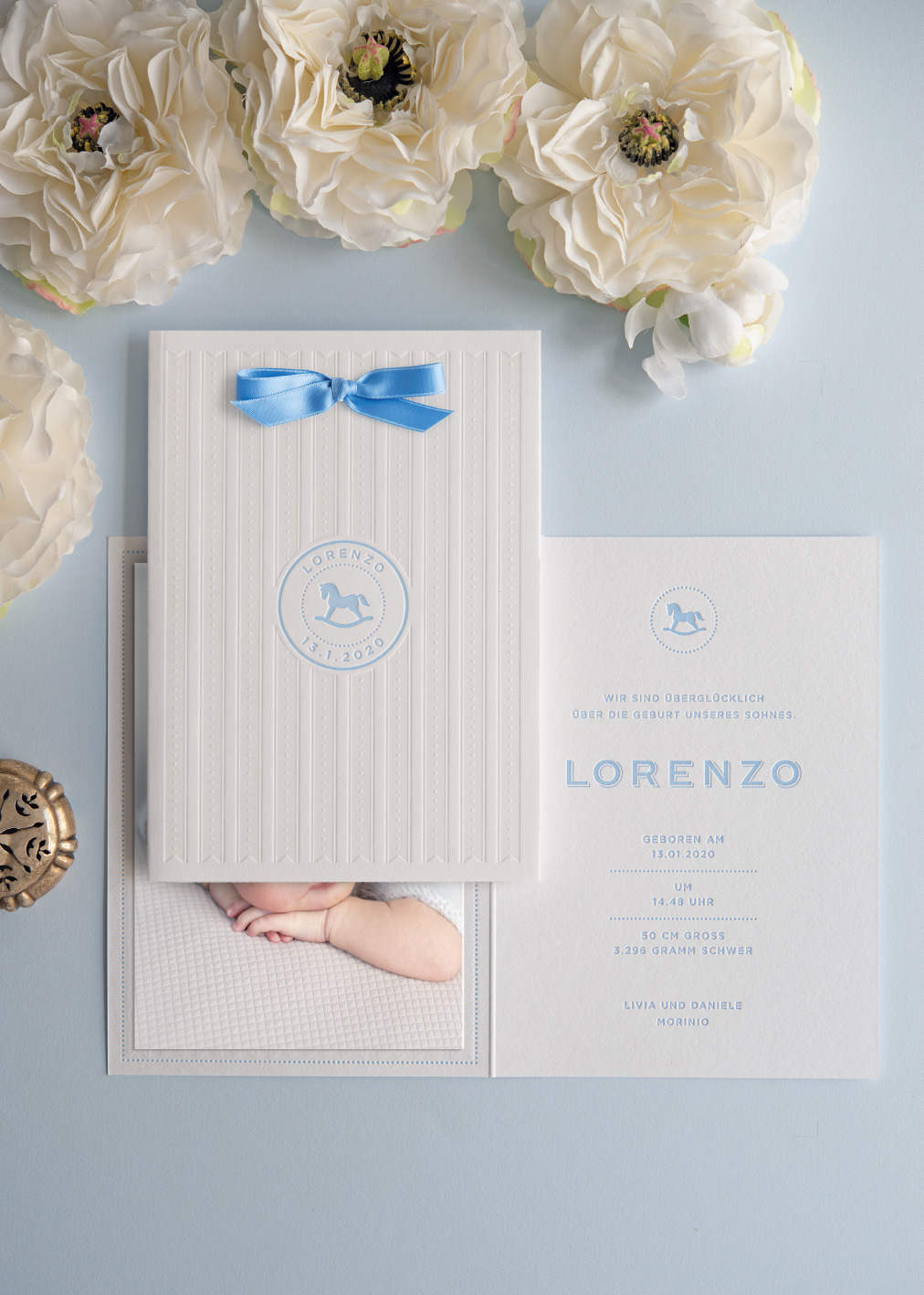 Lebendig wirkt diese Letterpress Geburtskarte allein durch die fein ziselierten sowie zart geprägten Schriftzüge – ganz ohne Muster oder Ornamentik. Aussagekräftig genug ist ja das in Worte und in Bilde gefasste Glück! Eine charmant-typografische Geburtsanzeigen-Lösung, der kräftige, außergewöhnliche Druckfarben genauso gut stehen, wie Naturtöne.
