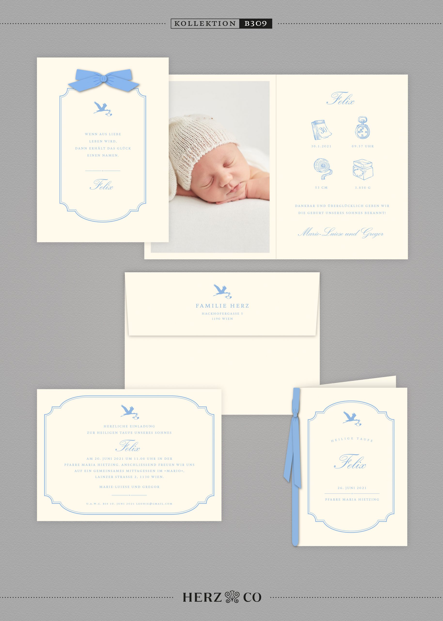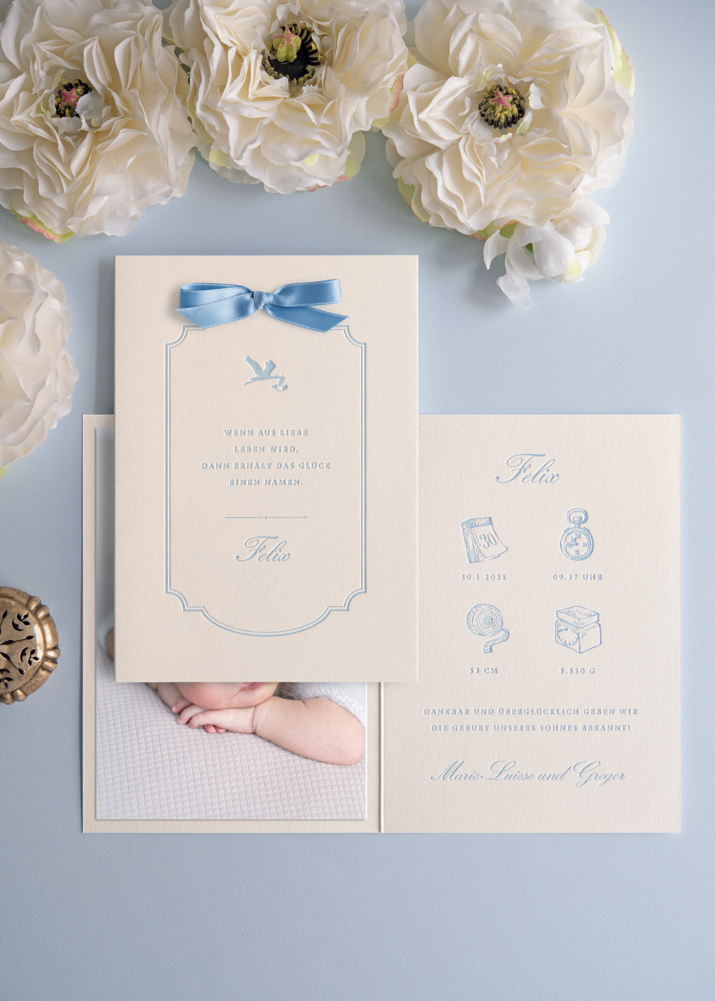 Eine Klappkarte mit zwei integrierten Bildern, stellt für viele unserer Kunden, die ein weiteres Baby erwarteten, eine attraktive Lösung dar. Das Einbetten eines ansprechenden Einzelportraits in einer von Herzlichkeit geprägten Atmosphäre vorderseitig sowie das Aufbringen des liebevollen Familienbildes innenseitig ist ja auf dieser haptischen Letterpress-Geburtskarte perfekt machbar. Noch einprägsamer wirken Geburtsanzeige und Tauf-Papeterie in typischen Baby-Tönen.