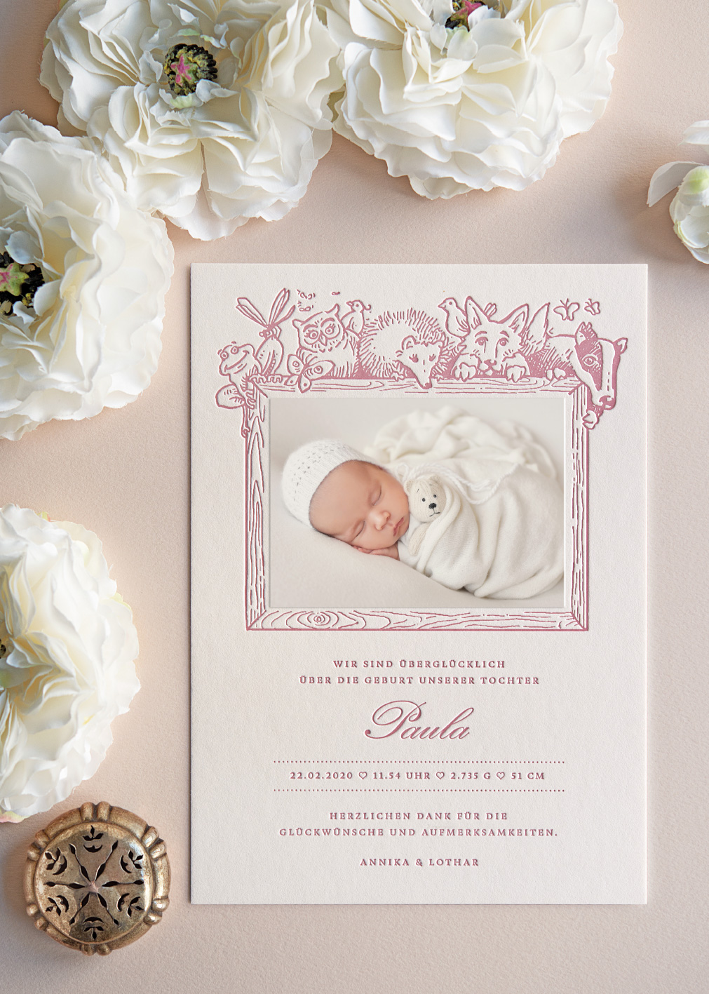 Liebevoll umrandet wird das Foto des neugeborenen Babys auf dieser Letterpress-Geburtsanzeige von handgezeichneten süßen Waldtieren, die nicht nur emotional, sondern auch taktil auf dem exklusiven weichen Büttenpapier beeindrucken. Ob in sanften Pastelltönen oder in kräftigeren Farbnuancen gedruckt, die entzückenden Tierfiguren zieren die Taufeinladung ebenso geschmackvoll, wie die haptischen Menükarten bei der Tauffeier oder die Taschentuchhalter für die Freudentränen während der Zeremonie.