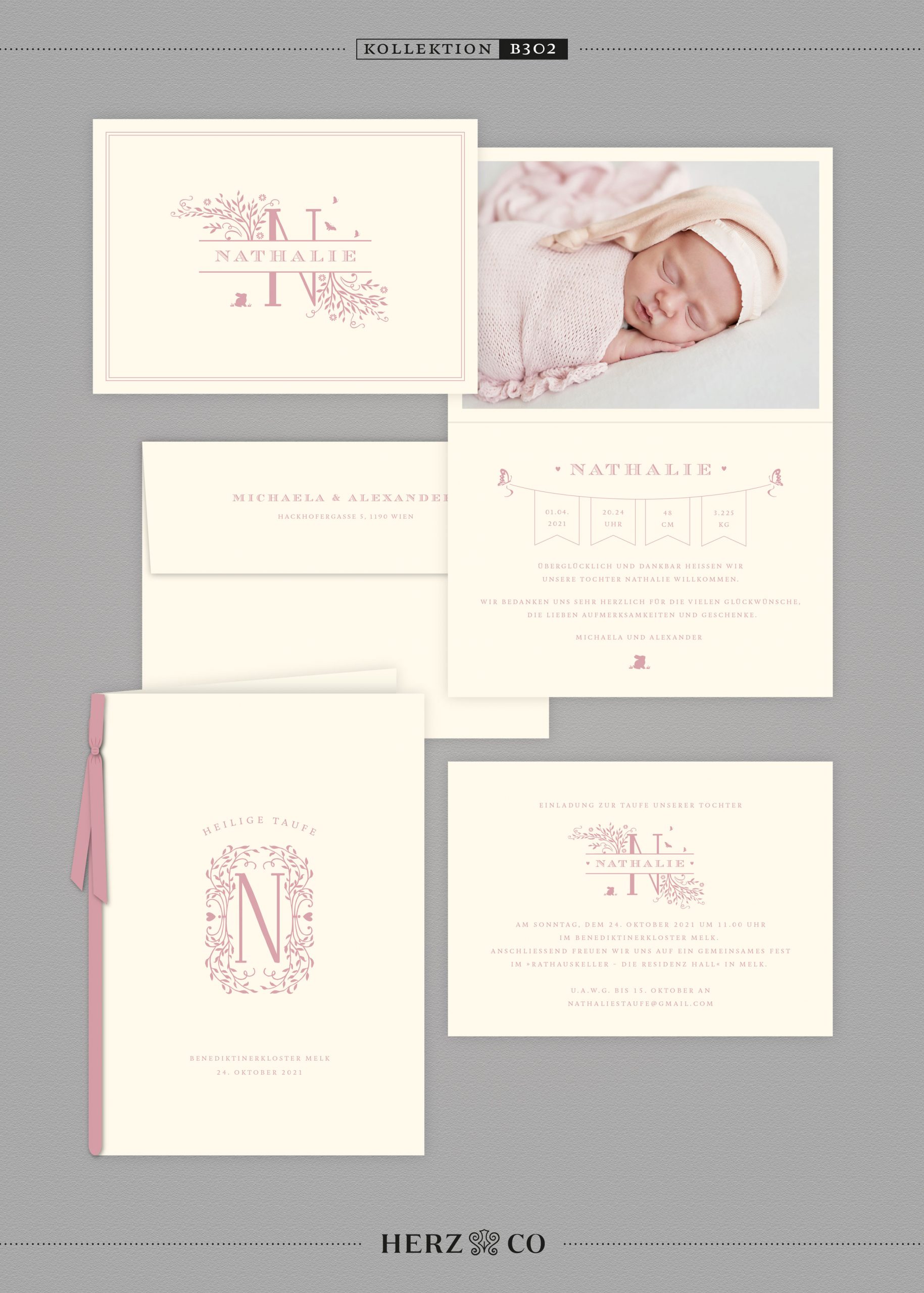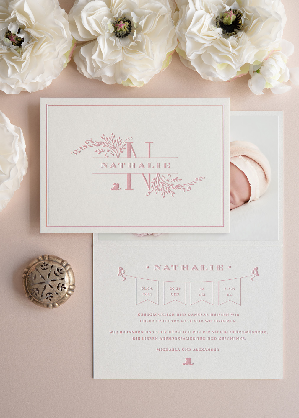 Mit farblosen Rillen-Verzierungen an der Vorderseite wirken Letterpress-Klappkarten direkt federleicht. Die zarten Farbtöne und die geschmackvolle Oval-Form in Pünktchen aufgelöst, runden das Bild dieser gelungenen Geburtsanzeige ab. Auf der Innenseite ist alles auf den neugeborenen kleinen Liebling abgestimmt – tastbar eingedruckt werden Name, Geburtstag, die genaue Uhrzeit, in vielen Fällen auch Maße und Gewicht, bis hin zu einer emotionalen Nachricht der Eltern. Auch hier können die zarten handgefertigten Satinschleifen nicht fehlen.
